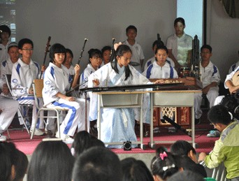 慰问演出以胡军老师的一节名为《中国民族音乐》的音乐课为基础展开。乐团的同学们首先在胡军老师的指挥下,演奏了合奏《龙腾虎跃》,之后胡军老师按照中国民族乐器产生年代,向太阳村的50多名孩子分别介绍了中国民族乐器古琴、笛子、二胡、琵琶等乐器的历史和音色,期间,徐镝清、李雨萌等同学分别展示了古琴、扬琴等乐器,最后,胡军老师向太阳村的孩子们介绍了民乐经典作品《瑶族舞曲》的相关知识,并指挥乐团演奏了此曲,同学们精彩的演奏,博得了太阳村同学们热烈的掌声。
