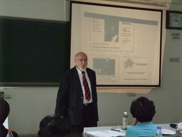 讲学期间,在德语系的安排下,Spillner教授还于6月27日下午为德语专业的师生们作了“快乐的问候广告——德文媒体中的一种新体裁”的专题报告。此次报告主要围绕近几年来德国一种新型的广告——“快乐的问候”展开,展示了其呈现的形式和独特的内容,分析了其针对的人群以及作用效果等,使同学们真实地了解到目前德国媒体方面的最新动态。Spillner教授清晰的讲座脉络和幽默的言语风格使整场讲座气氛十分活跃。北京外国语大学、北京航空航天大学以及北京第二外国语大学的部分德语系师生也应邀前来参加了此次讲座。