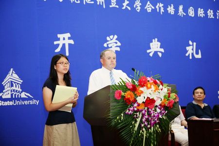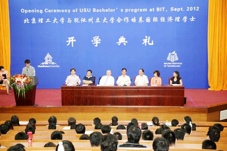 北京理工大学与美国犹他州立大学合作办学项目2012级新生9月10日下午开学,并举办了开学典礼,开学典礼在北京理工大学校中心教学楼一层报告厅隆重举行。典礼由罗佳书记主持,参加开学典礼的有:北京理工大学副校长孙逢春教授、犹他州立大学Jon Huntsman商学院经济与金融系主任Tyler Bowles教授、中国学术项目副主任赖超群博士、我校国际交流合作处邢清清副处长、国际教育合作学院梅文博院长、罗佳书记、李小平副院长、教师代表、项目管理老师以及全体新生
