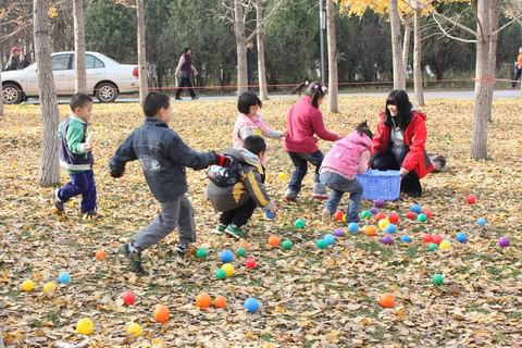 各班幼儿集结在银杏树林,自由选择参加各项活动。