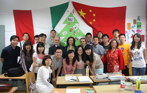 马里奥•卢斯科尼主席首先在欧语学院意大利语教室聆听学生上课情况并与学生亲切交流、合影留念。