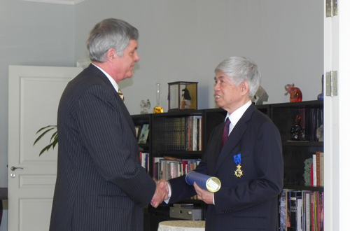 比利时驻华大使奈斯先生代表比利时国王阿尔贝二世向我校法语系王炳东教授颁发了“利奥波德二世国王勋章”,以表彰王炳东教授在促进比利时文学在中国的传播和增进比中文化交流方面所做出的贡献。