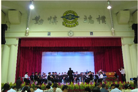 新加坡南洋女中95周年校庆,复旦附中管乐团非常荣幸能够作为表演嘉宾为这所与复旦附中有着笃深友谊的姐妹学校献上祝福。乐团排练中,同在新加坡参加SAGE会议的王德耀书记、前任校长谢应平、校长助理虞晓贞老师都特意前来为乐团加油打气,并观看了全场演出。晚上7:00,大幕拉开,在林友声老师的指挥下,乐团演奏了《可爱的一朵玫瑰花》、《水手与大海的歌》、《野蜂飞舞》三首曲目。《可爱的一朵玫瑰花》抒情悠扬让人回味无穷,《水手与大海的歌》作为乐团的保留曲目,大气磅礴赢得阵阵掌声,摇滚版的《野蜂飞舞》激情四射充分体现出了学生们的朝气与活动!整场演出将复旦附中管乐团的演奏水平淋漓尽致地发挥出来得到了在座来宾的喜爱和肯定。