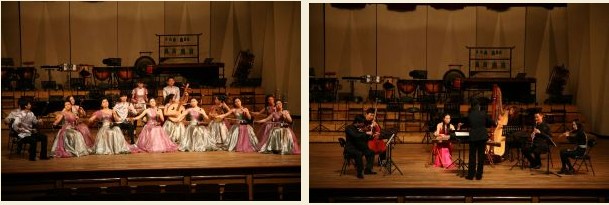 简短的会谈之后,学院邀请考察团成员在音乐厅观看了一场由优秀师生精心呈现的欢迎音乐会。音乐会的曲目中西合璧,传统与现代交相辉映,巴托克的《第一弦乐四重奏》(“弦之风云”四重奏组)、理查·斯特老斯的《小提琴奏鸣曲》(高参、谭小棠),叶小纲的《巴松错》(苏畅等)、常平的《圣风》(民乐系“圣风”组合),以及由中国青年交响乐团(指挥陈琳)演奏的德沃夏克《第八交响曲》(第一、二乐章)和中国青年民族乐团(指挥王甫建)演奏的《卢沟晓月》(赵季平)和《龙跃东方》(刘长远),都给来宾们留下了美好而深刻的印象。